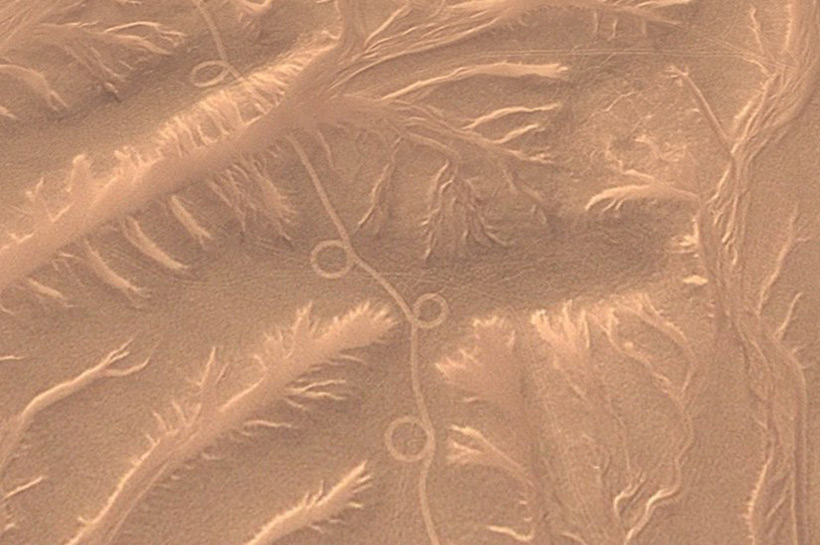 Гораздо более удивительно то, что на теле пустыни, а точнее под ее песками, есть очень много линий, которые внезапно делают петли и затем продолжаются дальше. Как правило, это совершенно идеальные окружности. Такие линии могут простираться на многие километры и через различные промежутки вновь делать петли. Затем еще и еще. Причем, петли эти по размерам своим не маленькие. На фотографии ниже приведена петля, которая в диаметре составляет 1 километр.