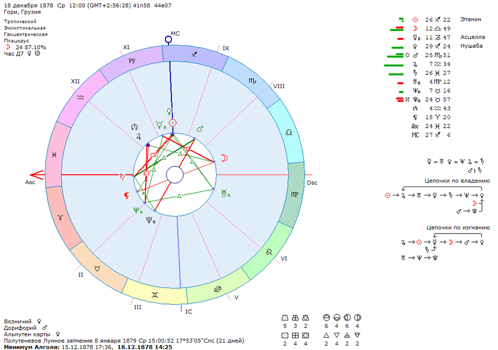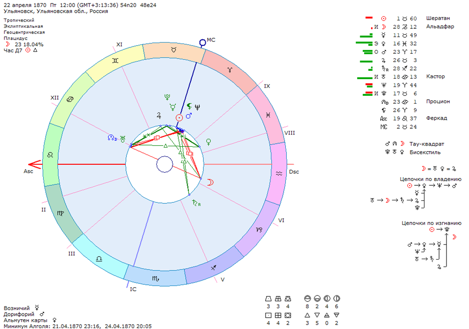 Солнце 2 Тельца; Меркурий 12 Тельца; Плутон 17 Тельца; Юпитер 26 Тельца; Уран 18 Рака; Сатурн 28,5 Стрельца; Луна 28 Козерога; Венера 16 -17 Рыб; Нептун 20 Овна; Марс 23 Овна.