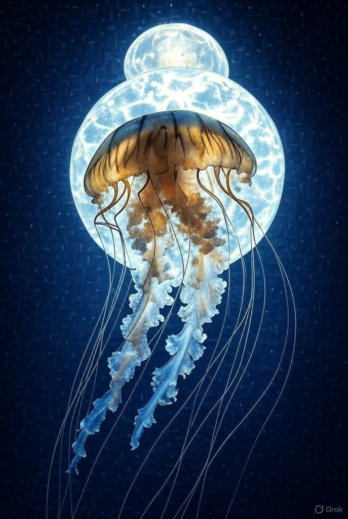 Воображаемая медузка, питающаяся фрил из солнечной энергии (создана совместно с grok)