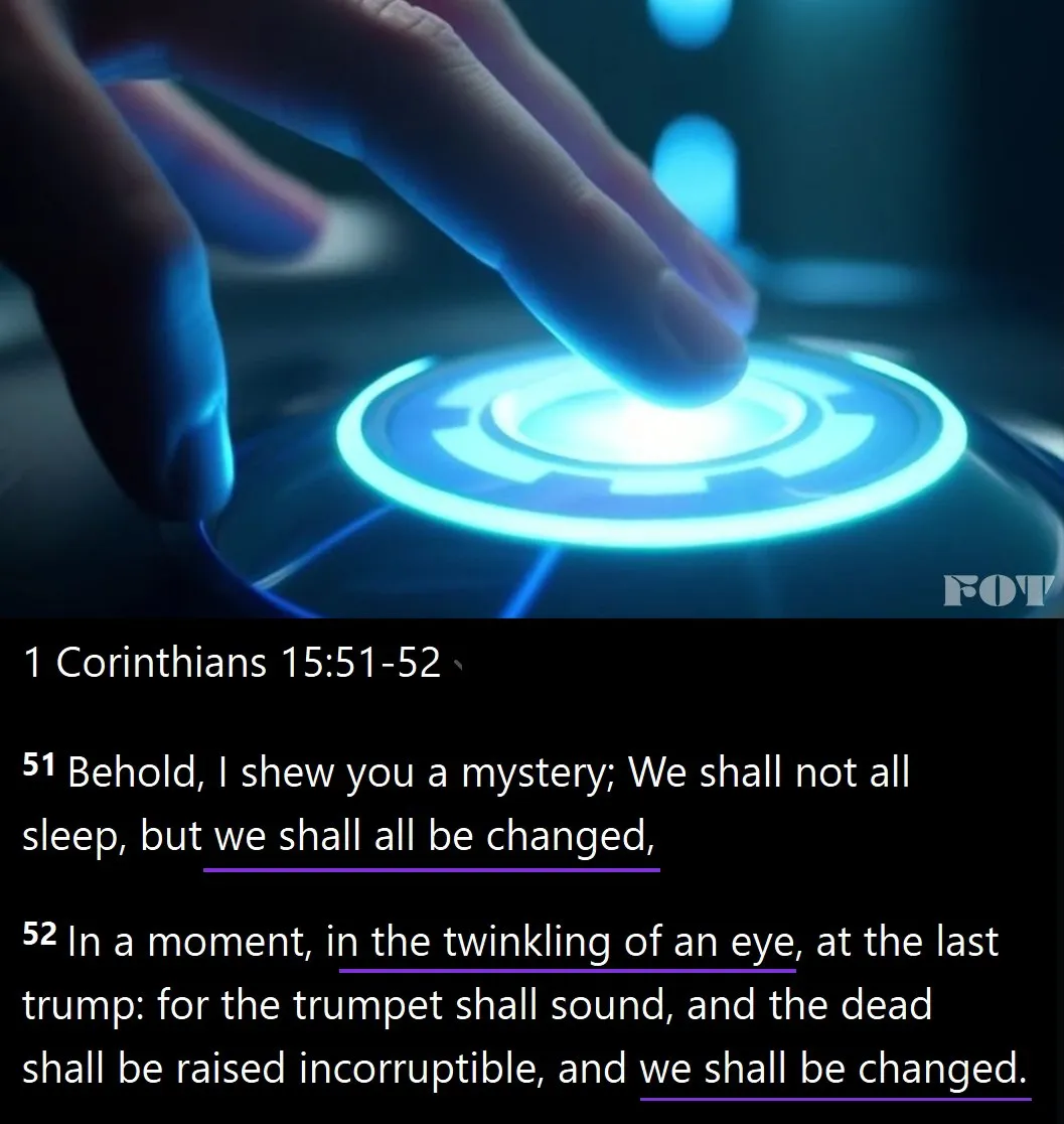 1-е Коринфянам 15:51-52. «51 Говорю вам тайну: не все мы умрем, но все изменимся, 52 вдруг, во мгновение ока, при последней трубе; ибо вострубит, и мертвые воскреснут нетленными, а мы изменимся«.