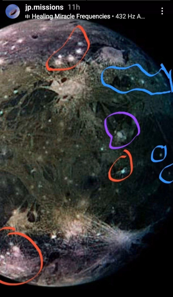 На самом большом спутнике Юпитера, Ганимеде, разместятся базы Межгалактической конфедерации (29, красные круги), Галактической федерации миров (4, синие круги) и Совета Алнилама (27, фиолетовые). Вы можете узнать больше о Ганимеде по ссылке (30). Гинво, по-видимому, наиболее заметен из членов Совета Алнилам на Ганимеде.