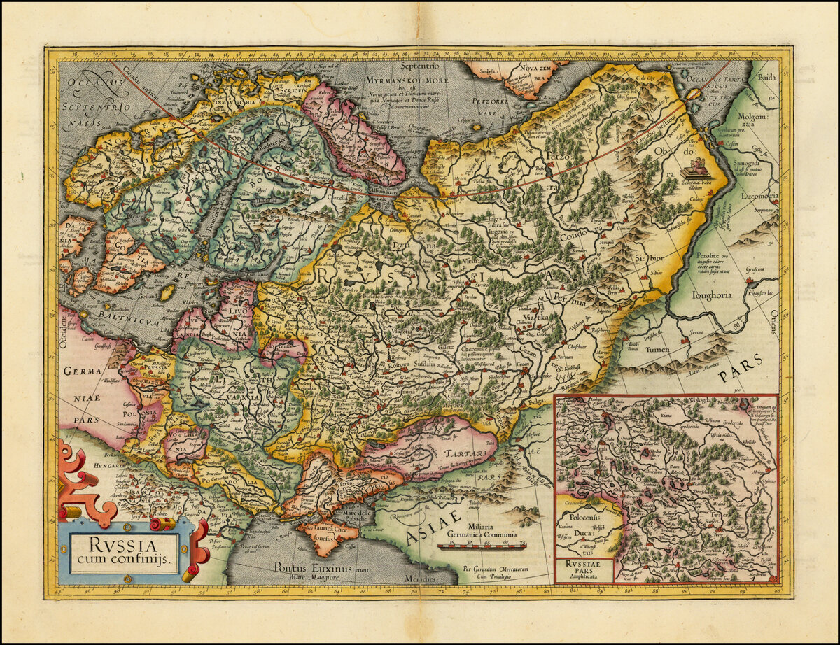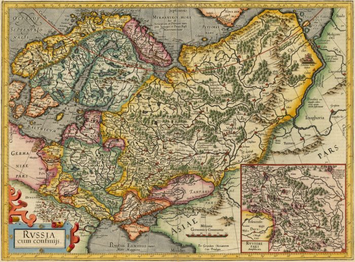 В 1595-м, спустя год после смерти картографа, вышел в свет его атлас с картами разных регионов мира. В том числе там есть и карта России. Она так и называется – «Russia cum confinijs» (Россия в ее границах). Вот как она выглядит целиком: