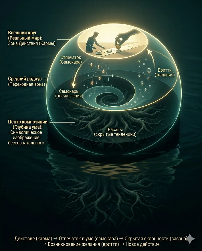 Действие (карма) → Отпечаток в уме (самскара) → Скрытая склонность (васана) → Возникновение желания (вритти) → Новое действие