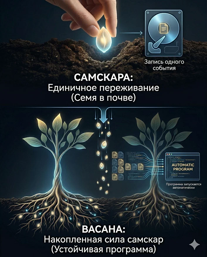 Каждое переживание записывается и хранится в бессознательном уме и теле в символической форме. Когда самскара не «переваривается» осознанно, она уходит глубже – и становится васаной: устойчивой бессознательной тенденцией тянуться к определённому переживанию снова. Желание порождает действие, действие рождает новый отпечаток, круг замыкается.