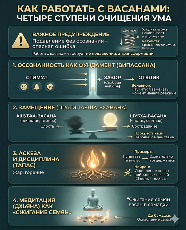 ⚠️ Важное предупреждение: подавление васан без осознания – одна из самых распространённых и опасных ошибок. Когда желание не осознаётся, а просто запрещается себе, оно не исчезает: оно уходит глубже в бессознательное, где накапливает напряжение. Именно оттуда оно возвращается – в виде срывов, психосоматики или неконтролируемых реакций. Работа с васанами требует не подавления, а трансформации.